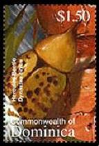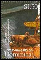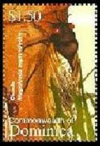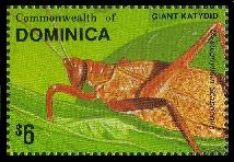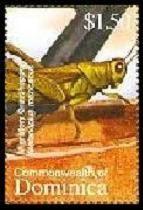 The small seat on which a kind of a grasshopper was drawn is issued as a memorial stamp for Columbus visit to a shore 500 years from this Commonwealth of Dominica in 1992.