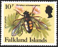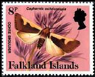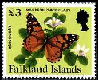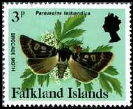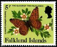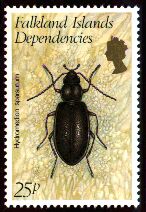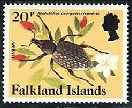 Insect Stamp of Falkland IslandsThe Falkland Islands are a British territory located 500 km east of the southern tip of Argentina in South America, in the southwest Atlantic Ocean. They have been under British control since 1833 and continue to this day. The islands consist of two large islands, East Falkland and West Falkland, along with 776 smaller islands, totaling an area of 12,173 square kilometers. Both East Falkland and West Falkland have mountain ranges, and most of the islands are barren wastelands; however, the flat land of East Falkland serves as pasture for sheep.