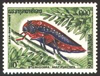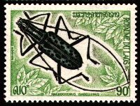 The butterfly and moth stamp was issued from Laos in 1965. The beetle stamp was issued in 1968. The beetle stamp was issued after that also in 1974. It is the very beautiful stamp of intaglio multicolored printing. Southeast Asia is called treasury of an insect, the butterfly stamp of the beginning of Sarawak in the world is begun, and insect stamps including much longhorn beetle and jewel beetle are issued from each country.
