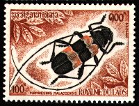 Insect Stamp of LaosLaos has about the same area as to Japanese Honshuan and is a socialist state in a Southeastern Asian only landlocked country. The first united national orchid sun kingdom is formed in the 14th century. French rule was strengthened, and it was admitted into French Indochina in 1899 after it was divided in the 18th century, and Thailand was governed. It passed through Japanese occupation and became independent after World War II partially as Laos kingdom in 1949 and got French approval in 1953 and completely became independent. It began a civil war and abolished monarchy in 1975 and shifted to the socialism system and became the Lao People's Democratic Republic afterwards.