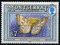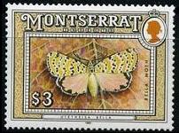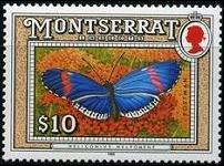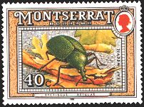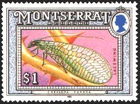Insect Stamp of MontserratMontserrat is a volcanic island located in the Lesser Antilles in the West Indies in the Caribbean Sea and is a British overseas territory. It was discovered by Columbus on his second voyage on November 3, 1493, and named "Santa Maria de Montserrat" after the Montserrat Monastery in Spain. Spain did not settle there at first, but instead, interest from England and France increased, and in 1625, King Charles I granted England a patent to allow colonization. In 1949, Irish political prisoners were transferred to Montserrat. Many buildings have been destroyed by the large eruption of the active volcano Soufriere Hills (1,050m) since 1995. The area is 102 square kilometers and the population is 4,650.
