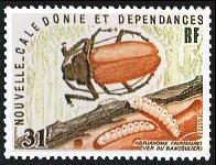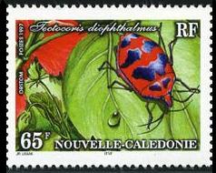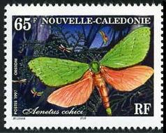 Insect Stamp of New CaledoniaNew Caledonia is on the South Pacific, and it is compring with Grand-Terre island that is the same size to Japanese Shikoku, Ile des Pins, Ouvea, Lifou, Mare and other small islands, and a Melanesian and a Polynesian lived from old days. British Captain Cook discovered Grand-Terre Island in 1774 and named New Caledonia. French La Perouse and many Catholic and Protestant missionaries visited it, and Napoleon III declared that New Caledonia was a French territory afterwards in 1853. It was an exile place of a French political offense until 1887. It is recognized a French overseas territory from a colony of a French territory in 1946 and maintains autonomy as the main industry by the nickel mining industry and sightseeing business while being a part of the French Republic.