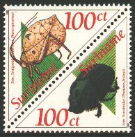 The triangular stamp with the taste which drew Kitydid, field cricket, grasshopper, longhorn beetle, weevil, jewel beetle, and the scarab beetle of the South America specialty was issued in 1993.