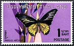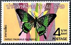 タイの昆虫切手タイは、インドシナ半島の中央部に位置し、東南アジア地域で唯一、欧州列強の植民地支配を免れた国です。元首に国王を頂く王制国家で、13世紀のスコタイ王朝、14世紀のアユタヤ王朝を経て、1782年にチャクリ王朝が創設され、1932年には正式に立憲君主国家となり、現在に至っています。国名はかってはシャム(SIAM)でしたが、1949年にタイ語で「自由な国」を意味するタイ(Thailand)に改められました。この名称は東南アジア諸国が欧州列強の植民地となる中でタイが独立を保ったことを示しています。