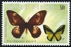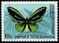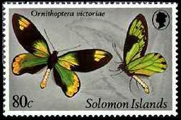 It is the typical kind of birdwing to which Ornithoptera priamus and Ornithoptera paradisea apply and inhabit Australia from Indo-China. Like a male in the female of birdwing, green brightness is not in feather. The stamp describing the female of Ornithoptera victoriae was issued from British Solomon islands in 1965, and the stamp describing the male was also issued from Solomon Islands which became independent in 1980. Please compare the male of the same Ornithoptera victoriae with the difference in a female.