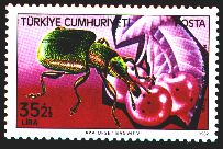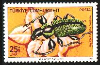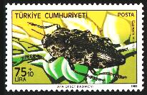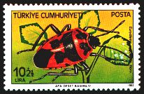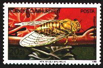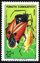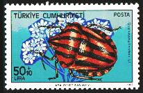 The insect stamp was issued from Turkey in 1980, 1981, 1982, and 1983. Various kinds of insects, such as playing mantid, cicada, fly, hover fly, tiger beetle, and leaf weevil, are drawn beautifully ecologically, and the stamp of Turkey is one of the favorite insect stamps. Two kinds of insects which will all be in the stamp of issue in 1980 at the relation of Natural enemy are drawn.