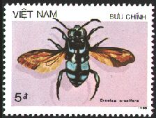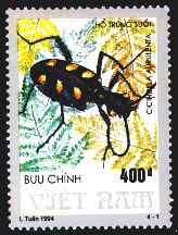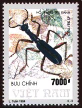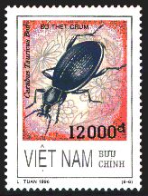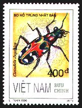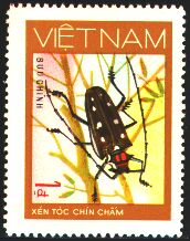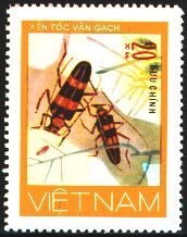 After that, south and North Vietnam were unified and Vietnam is borned. From this unified Vietnam, eight kinds of beetle stamps which drew longhorn beetle were issued in the same 1977. Eight kinds of stamps which drew Shield-backed Bug were issued further in 1982. Eight kinds of all are the beautiful new stamps unified by Shield-backed Bug. Eight kinds of insect stamps were issued also in 1986. After that, the beetle stamp was issued six kinds in 1994, and four kinds in 1996 respectively.