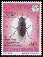 Tsetse fly carries out the medium of TORIPANOZOMA which is the pathogenic organ of sleeping sickness, and it is distributed over only the range of about 1,500km2 among ranges from lat. 15 degrees N of the African Continent to lat. 20 degrees S. Therefore the range of this latitude is called a Tsetsebelt zone. The way of speaking stiffens and becomes the letter of stitch and becomes shape suitable for sucking blood. The stamp describing this tsetse fly is issued from African countries.