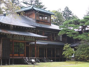 御 展 望 室 三階部分の部屋で普段は見学 出来ませんが、特別開放の期間 に合わせて見てきました。階下 の部屋とは大きく違って数寄屋 風の部屋で、移築後の御用邸と しての改装も最小限だったよう に思われます。 |