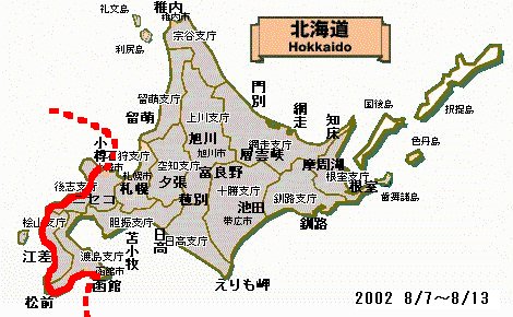----------------------------------------------------------------------- Date: Sat, 10 Aug 2002 21:47:06 +0900 From: Mineo Wakita [ei7m-wkt@asahi-net.or.jp] Subject: hokkaido-4 本日も、雨降りの一日でした。北海道に着いてから4日たちましたが、毎日 雨雨雨... です。これまで、いつも食べる話ばかりでしたが、夏の北海道は やはり温泉です。キャンプ場で泊まる場合も、必ず地元の温泉(露天風呂)が 隣接している所を選んでいます。 新潟から小樽に入る新日本海フェリーの中には、ガラス張りで日本海を一望 できる大浴室があります。実に気分爽快です。初日のニセコキャンプ場には 五色温泉があり、硫黄の匂いのする、また景色の良い露天風呂もあり、有名 な所です。 昨日は、江差の北に位置する熊石町立国民宿舎「ひらたない荘」に泊まりま したが、そこには「あわびの湯」という温泉場が隣接していました。きょう は、江差と松前の史跡を見学した後、吉岡温泉「ゆとらぎ館」の露天風呂に 入ってから、キャンプ場のある知内(しりうち)町に向かいました。 ここに来てから知ったのですが、松前郡福島町吉岡は、相撲の千代の富士の 出身地だったのですね。あちこちに幟(ノボリ)が立っていて、体育館よりも 大きな九重部屋の稽古場もありました。また、きょうのキャンプ地の知内町 は、歌手の北島三郎の出身地だそうです。 きょうも雨降りなので、車中泊です。気温は17度です。車の脇で登山用ガス でお茶を沸かして一段落してから、今、この旅行記を書いています。明日は、 いよいよ函館に入ります。 明日もまた雨みたいです... 松前城 撮影:平成14年8月10日
