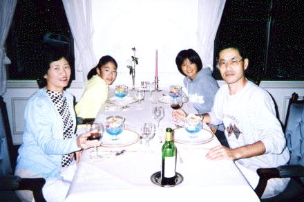 肌寒い雨が降りしきっていたので、食べ終わるとすぐに車に戻り、暖房を効 かせました。天気が良ければハリストス正教会や、旧イギリス領事館などを ゆっくり見学する予定でいましたが、とにかく強い雨が降っているので、昼 過ぎまで「赤レンガショッピングモール」で土産を物色した後、きょう宿泊 予定の B&B のペンション「カントリーボーン」に 3時にはチェックインし て宿の中でゆっくりしました。函館の夜景を一望に見渡すことのできる山麓 のペンションで、最高のロケーションにあります。 北海道最後の夜なので、夕食は、天皇・皇后両陛下も食されたという明治12 年創業の「五島軒本店(雪河亭)」でフランス料理のコースをじっくりと嗜み ました。子供達も慣れたもので、上手にナイフとフォークを使っていました。 明日は昼発で、函館から青森までフェリーで渡ります。夕方には青森です。 函館 五島軒本店(雪河亭) 撮影:平成14年8月11日