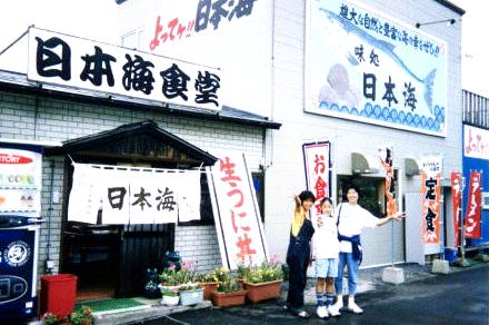 ----------------------------------------------------------------------- Date: Fri, 09 Aug 2002 21:43:54 +0900 From: Mineo Wakita [ei7m-wkt@asahi-net.or.jp] Subject: hokkaido-3 車の中で目が覚めると、まだ霧雨が降っていました。朝食は、コーヒーを入 れ、昨日のうちにスーパーで買っておいたトマトとキュウリをキャンプ場の 炊事場で調理し、それを挟んだロールパンを食べました。お湯は、登山用の 携帯ガスコンロで沸かします。登山用のガスは強力で、3000m級の冬山でも 実績積みです。 ランコシ シリベツ ニセコのキャンプ場から少し南に下った蘭越町を流れる尻別川の河川敷に、 よく整備された大きな緑の芝生に敷き詰められた公園があり、川の脇に数km に渡るこれも前面芝生の場所を、数人のお年寄りがパターゴルフをしていま した。絵美とお母さんは、持ってきた硬式テニス用具で1時間以上も対戦し ていました。美香も最初は一緒にテニスをしていましたが、後はずっと私と 一緒に雨蛙を追いかけたり、藤の木の種を取ったりして、のんびりと過しま した。 午前中は鉛色の雲がどんよりとしていましたが、午後からは本降りとなりま した。道路脇の気温表示は19度を示していて、一時は寒くて車の暖房をつけ たくらいです。昼食は、日本海沿いの閑散とした漁港の脇にある小さな店に 入りました。私と妻は、生ウニ丼。絵美の刺身定食の舟盛りには5種類ほど の新鮮な刺身が入っていました。 海老、鮭、ホタテ、そい(白身魚)... 美香はホッケ定食を食べました。美香は生まれて初めてホッケを見ましたが、 長さ35cm、厚み1.5cm はあろうかという特大のホッケを、骨だけになるまで 箸を使ってムシャムシャと上手に食べ切りました。美香のスケッチブックを 後でのぞくと、ホッケを茶色のクレヨンで大きく塗った、おいしそうな定食 の絵が描いてありました。 明日は江差・松前に向かう予定で、本日はその手前の熊石町にある国民宿舎 に泊まっています。 久しぶりの布団で、足を伸ばして寝ることができます。 アワビが特産で、夕食にはアワビの塩辛やアワビの刺身、大きなツブ貝、鮭 のムニエル、イカの丸焼き、と海産物尽くしでした。 日本海沿いの食堂にて 撮影:平成14年8月9日
