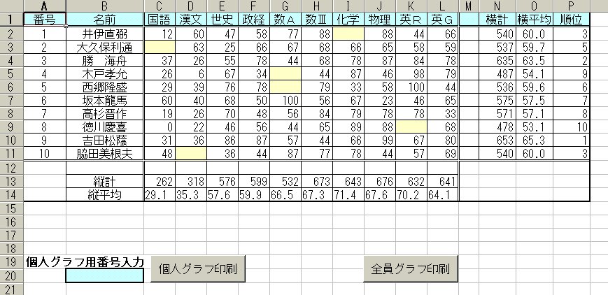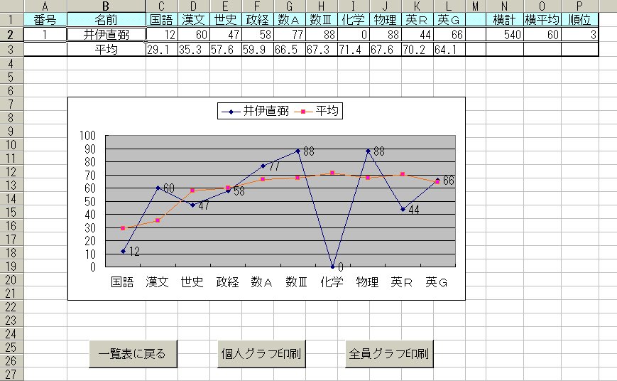 ------ [Module1] ------ Sub 個人票作成() If Range("B20") = "" Then Beep Exit Sub End If Worksheets(2).Select Worksheets(2).Name = Range("B2").Value Range("B2").Select End Sub Sub 個人票印刷() Worksheets(2).PrintPreview End Sub Sub 一覧票に戻る() Worksheets(2).Name = "個人" Worksheets(1).Select Range("B20").ClearContents Range("A1").Select End Sub Sub 全員票印刷() Range("B20").Value = 1 Worksheets(2).PrintPreview For i = 2 To 10 Worksheets(1).Select Range("B20").Value = i Worksheets(2).Select Worksheets(2).Name = Range("B2").Value Worksheets(2).PrintOut Worksheets(2).Name = "個人" Worksheets(1).Select Range("B20").ClearContents Next i End Sub back top