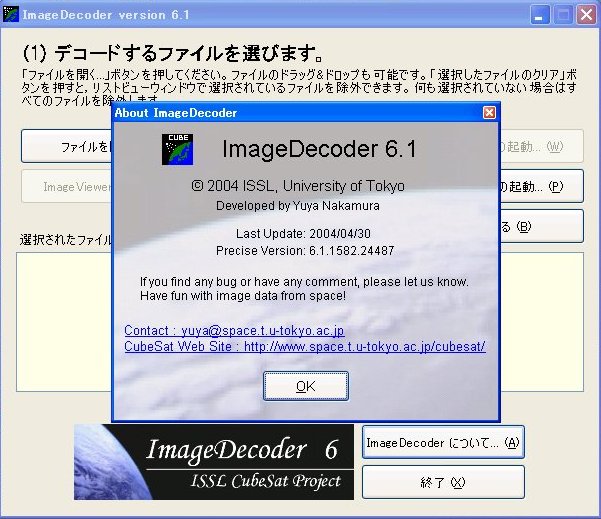 ● (No.418) XI-IV/V 解析用, 新ImageDecoder Ver6.1 (2004年 5月2日) --------------------------------------------------------------- Subject: ImageDecoder 6.1 の公開について Date: Sat, 01 May 2004 14:42:06 +0900 From: Yuya Nakamura To: jamsat-bb JAMSAT-BBのみなさま 東大XI-IV管制局の中村です. いつも XI-IV を受信いただきましてありがとうございます. 今回 ImageDecoder をアップデートし,みなさまに公開させていただく ことにいたしました.バージョンは 6.1 となっています. これまでは,ヘッダを指定したり,エラーデータを手動で除去したりと 解析されるみなさまには多大なご苦労をおかけしてしまっておりました. このバージョンでは,すべての処理が自動化され,ユーザは解析すべき ファイルと出力フォルダを指定するだけでよくなっています. また,本ソフトウェアは今後打ち上げが予定されているXI-Vの解析にも 対応しています.XI-Vは現在軌道上の XI-IVよりも多彩な撮影モードが 用意されており,打ち上げ後,より一層宇宙からの画像を楽しんでいた だけるものと考えております. これを機会に,まだ XI-IVを受信されたことのない方やパケットをデコ ードされたことのない方もぜひチャレンジしていただければと思ってお ります.どうぞよろしくお願いいたします. ImageDecoder 6.1 では,動作に .NET Framework 1.1以上が必要となる など,いくつかの動作条件があります.ダウンロードファイルを解凍し た際に同梱されている テキストファイル,PDFファイルをよくお読みに なったうえでご利用ください.ダウンロードは, http://www.space.t.u-tokyo.ac.jp/nlab_gs/index_ja.html から「運用情報」→「XI-IVデータ解析アプリケーション」の順に進み, ImageDecoder の項からお願いいたします. 本ソフトウェアについてのご意見やご質問は中村までお願いいたします. //////////////////////////// 東京大学大学院工学系研究科 航空宇宙工学専攻 中須賀研究室 博士課程1年 中 村 友 哉 ////////////////////////////![]()