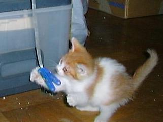 「とら」 '99/9 ぺろりと餌を食べた後は、小物で遊ぶのが大好き!