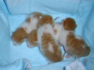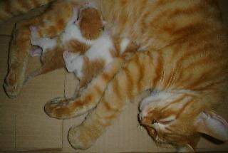 「親になったニャオ」 というわけで、子猫が生まれました。それぞれ、白+茶+黒、白+黒、白+茶、のかわいい子猫です。きっとお父さん猫は白と黒の猫だったんですね。(^^;