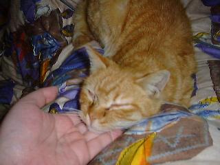 「座布団のベッド」 '99/2、自宅で。 気持ちよさそうに寝てます。最近、肉球の握手を仕込んでます。
