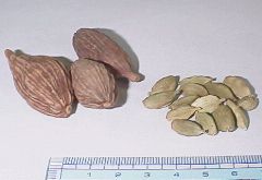 | カルダモン | 小豆蒄(しょうずく) | ★★★★ | ★★ | 大変高貴な香りがあり、スパイスの王様とも呼ばれる。緑色の鞘の豆のような形。香りを薄く長く保たせたいときは鞘のまま、通常は鞘ごと粉に挽いて使う。ガラムマサラには必須。 緑色の種類の他、茶褐色の大きい野生種もある。手に入るなら取り混ぜて使うと良い。 |