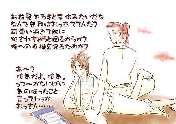 ![]() 落書きに色つけてみました。 甘寧の髪、降ろしたらどんな感じかな、と思って。 でも、元から少し癖毛で、軽く立っちゃうの希望。 高校時代、普段は髪下ろしてるのに、 体育祭の時だけモヒカンをばっちり立ててた 後輩がいたっけなぁ……。 とか、 思い出しながら描きました(苦笑) (もちろん、脇の髪はいつもきっちり剃ってました) 使用ソフト:フォトショ6 |