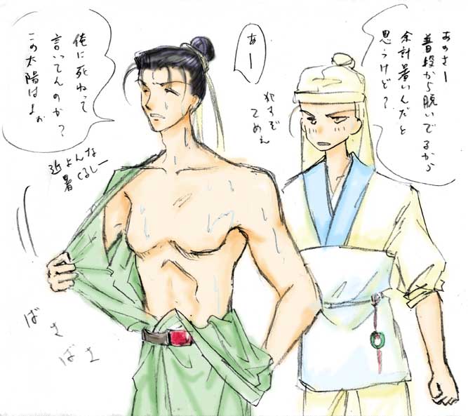 いきなりふっと呂蒙と甘寧が描きたくなって、暑くて堪らなかったので描いた呂蒙と甘寧です。呂蒙の方が小さいのは、遠近感ということで一つお願いします。目の前にあったクロッキーブックに殴り描いて、そのまま色つけてアップしちゃいました。あんまりにも更新してないので、まぁ、生きてるぞ〜!!ということで。生存確認用イラストと言うことでorz
