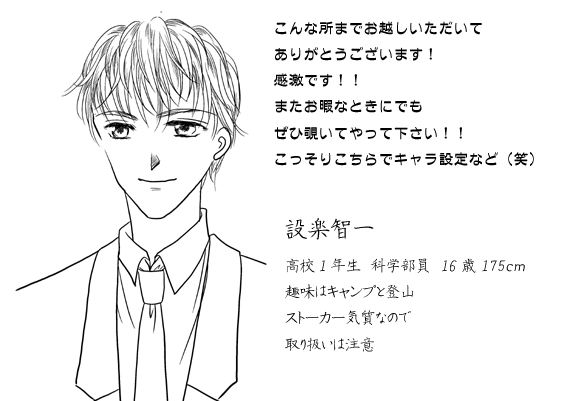 ![]() 実は受けでも攻めでもOKな感じを目指して描いています(笑) 気を抜くと受けくさくなっちゃうのですが。 ほら、奴はストーカーですから。 ![]() 顎尖りすぎた……orz 前髪を避けると美形(ププッ)、という設定です……。 ![]() 高柳先生、現在トーン髪になりつつあります。 イメージ的に、髪の色黒いかな、と。 ![]() 大竹先生を猫背に描くのが難しいです……orz 髪の色はプールのカルキで少し明るいですが、染めてません。 ![]() 笹原先生のお話は、智一君達の話が一段落付いたら書きたいなぁと準備しております。 ![]() ……多分、この兄妹を書くのは最初で最後…… ![]() 宮嶋先生は「やさしそうな美形だけど脱いだらすごい」設定なので、 描くのに勇気がいります……。 ![]() 逆にユウマは描きやすいです(^ω^;) ガチムチ万歳!! ![]() 是枝さん この絵だとあんまりガチムチな感じにならなかった……。 宮嶋先生以上に脱いだらすごい設定なのに……!! |