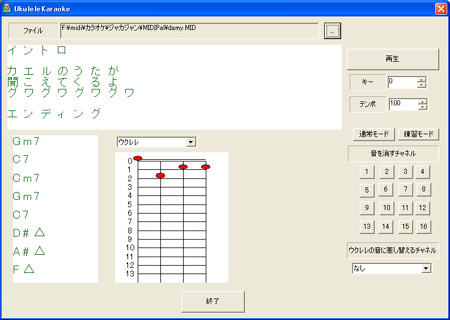 PCカラオケ用に作成されたMIDIファイルを読み込むと、歌詞とコード進行を表示します。再生すると、曲にあわせて、コードの押さえ方をウクレレの図上に表示します。ウクレレだけでなく、一五一会にも対応しています。