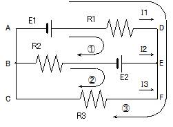 キルヒホッフの法則を左の図に適用するとE点については第一法則により