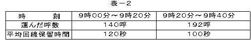 (3)ある回線群の午前9時00分から午前9時20分まで及び午前9時20分から午前9時40までの各20分間に運んだ呼数及び平均回線保留時間を調査したところ、表−2に示す結果が得られた。この回線群の午前9時から午前9時40分までの40分間における呼量は、(