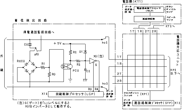 (T)外線からの呼出信号は、整流された後ホトカプラ(PC0)を導通する。PC0の出力は、回路制御プロセッサ(LCP)に制御された(