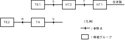 (3)図に示すようにISDN基本ユーザ・網インタフェースの参照モデルは、NT1、NT2、TA、TE1及びTE2の機能グループと参照点S、T及びRから構成される。このうち、NT1は、(