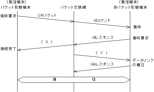 (2) 図は、パケット形態端末とHDLC手順を用いる非パケット形態端末間のVCにおける通信シーケンスを示したものである。Xは( イ )、Yは( ウ )を表す。