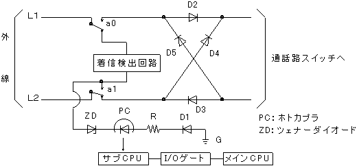 ウ )で検出することにより、中央制御装置(CC)は着信があったことを識別し、内線に対して可視又は可聴信号により着信表示を行う。内線が応答すると、Bリレーの動作により通話路を設定し、着信表示を復旧させる。