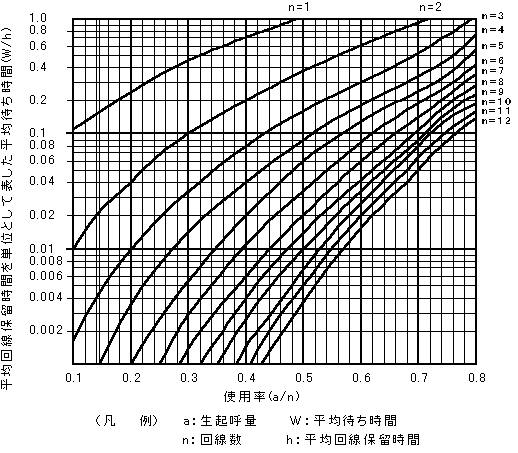 (2) アーランの待ち合わせ式で、ある交換線群の出回線数がn、加わる呼量をaアーラン、平均回線保留時間をh、待ち合わせに入る確率をM(0)としたとき、平均待ち時間Wは(
