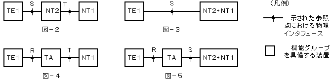 (5) 図−2〜図−5は、ISDN基本ユーザ・網インターフェースの参照点における物理インタフェースの組合せを示す構成例である。このうち、ISDN端末を接続できる構成例は、( オ )だけである。  (4点)