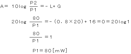 また、電気通信回線への入力電力をP1、出力電力をP2、電気通信回線の伝送損失をL、増幅器の利得をGとすると伝送量Aは次のようになり、この式に各値を代入しP1を求めると、