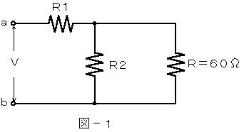 (1) 図−1に示す回路において、端子a−b間の合成抵抗が抵抗Rに等しく、かつ、抵抗R2が( ア )オームのとき、Rの両端の電圧は、端子a−b間の電圧Vの1/4である。