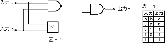 (3) 図−1の論理回路において、Mの論理素子が( ウ )であるとき、入力a及び入力bの論理レベルと出力cの論理レベルとの関係は、表−1の真理値表で示される。