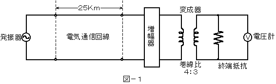 (1) 図−1において、電気通信回線への入力電圧が240ミリボルト、その伝送損失が1キロメートル当たり1.2デシベル、増幅器の利得が10デシベルのとき、電圧計の読みは、( ア )ミリボルトである。ただし、変成器は理想的なものとし、入出力各部のインピーダンスは整合しているものとする。