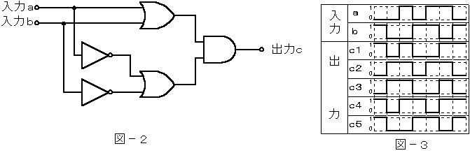 (4) 図−2の論理回路において、入力a及び入力bに図−3に示す入力がある場合、図−2の出力cは、図−3に示す出力のうち( エ )である。