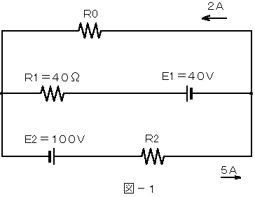 (1) 図−1に示す回路において、矢印のように電流がながれているとき、抵抗R2の値は、( ア )オームである。ただし、電池の内部抵抗は無視するものとする。