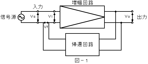 (2) 図−1において、信号源の電圧Vsと入力側に戻る電圧Vfによって、増幅回路の入力電圧Viを合成するとき、VsとVfとが( イ )の関係にある帰還(フィードバック)を負帰還といい、( ウ )回路の周波数特性等の改善に用いられる。