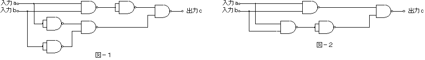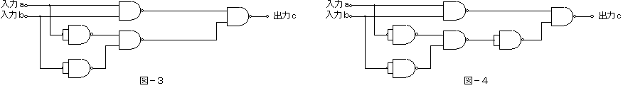 (3) 図−1〜図−4は、NANDの論理素子のみを用いた論理回路を示したものである。このうち、入力a及び入力bの論理レベル(それぞれA及びB)と出力cの論理レベル(C)との関係が、