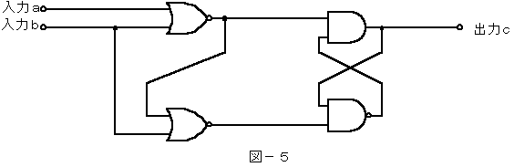 (4) 図−5の論理回路は、入力a及び入力bの論理レベルと出力cの論理レベルとの関係から、( エ )の回路に置き換えることができる。