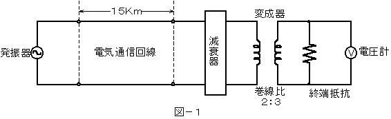 (1) 図−1において、電気通信回線への入力電力が( ア )ミリボルト、その伝送損失が1キロメートル当たり1.0デシベル、減衰器の減衰が5デシベルのとき、電圧計の読みは、18ミリボルトである。ただし、変成器は理想的なものとし、電気通信回線及び減衰器の入出力インピーダンスはすべて同一で、各部は整合しているものとする。