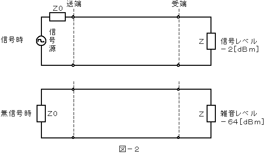(3)図−2に示すアナログ方式の伝送路において、受端のインピーダンスZに加わる信号のレベルが−2[dBm]で、同じ伝送路の無信号時の雑音レベルが−64[dBm]であるとき、この伝送路の受端におけるSN比は( ウ )デシベルである。