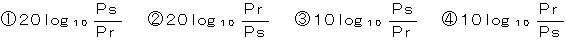 (4)ある伝送路の送信端における信号電力をPsワット、受信端における信号電力をPrワットとするとき、この伝送路の伝送損失は、( エ )デシベルで表され、Pr<Psのときに伝送損失が正の値となる。