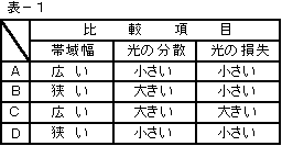 (5) 光ファイバには大きく分けて、SM形とGI形とがある。このうち、SM形の伝送特性をGI形の伝送特性と比較して示すと、おおむね、次の表−1の( オ )となる。