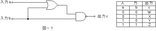 (3)図−1の論理回路において、入力a及び入力bの論理レベルと出力cの論理レベルとの関係が右の真理値表で示されるとき、表中の出