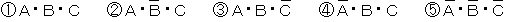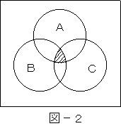 (4)図−2に示すベン図において、A、B及びCは、それぞれの円の内部を表すとき、塗りつぶした部分を示す論理式は、(