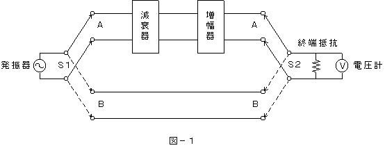(1) 図−1において、スイッチS1及びS2をB側に接続した状態での電圧計の読みは、48ミリボルトである。次にS1及びS2をA側に切り替え、減衰器の減衰量を12デシベル、増幅器の利得を(